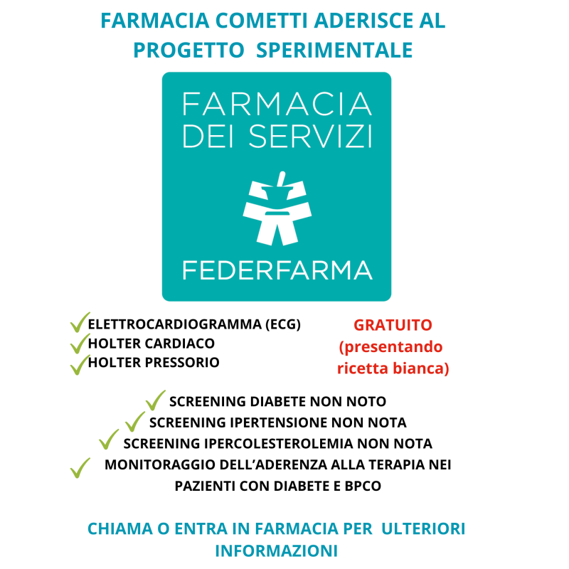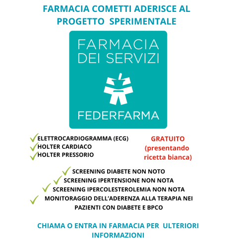 Tra gli altri servizi, è possibile richiedere Test di autoanalisi direttamente in farmacia per il controllo di intolleranze alimentari, glicemia, profilo renale e profilo lipidico completo. E' possibile eseguire gli screening del diabete non noto, ipertensione non nota, ipercolesterolemia non nota ed effettuare il monitoraggio dell'aderenza alla terapia nei pazienti con diabete e BPCO.